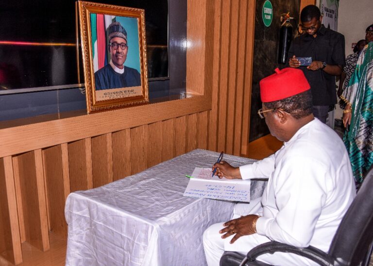 Engr. Umahi during the signing of a book of condolences at the Ministry's Headquarters at Mabushi in Abuja By Chris...